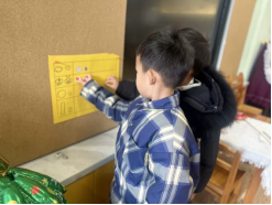 孩子们激烈地讨论着,我们收集了几个人气比较高的名字,请孩子们进行了投票。最终,“大大”和“小小”以微弱的票数险胜,成为了两只小羊的新名字。